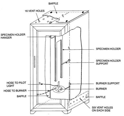 Dit apparaat wordt gebruikt voor het evalueren van de vlambestendigheid van textiel, meerlaags weefsel, stoffenassemblages die worden gebruikt in japonnen en kampeertenten.