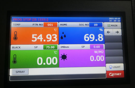 2. Kleurrijk touchscreen, geeft de toestand van de kamer in realtime aan, kan de bestraling, temperatuur (BPT, BST, kamer), vochtigheid vooraf instellen en de dynamische curve ervan plotten.De operator selecteert eenvoudigweg de vereiste testmodule en teststandaarden;Engelse gebruikersinterface, diagram geeft de toestand van de kamer aan, gemakkelijk te gebruiken;