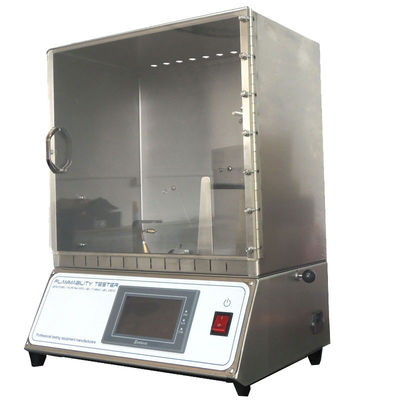 Voor de bepaling van de verbrandingskenmerken van textiel onder gecontroleerde omstandigheden: testkast van roestvrij staal met glasobservatiepaneel voorzien van automatische tijdsberekening van de vlamverspreiding in 0.1-seconde-inkrementen vanaf ontsteking- Borstelapparaat inclusief reserve nylon borstel.